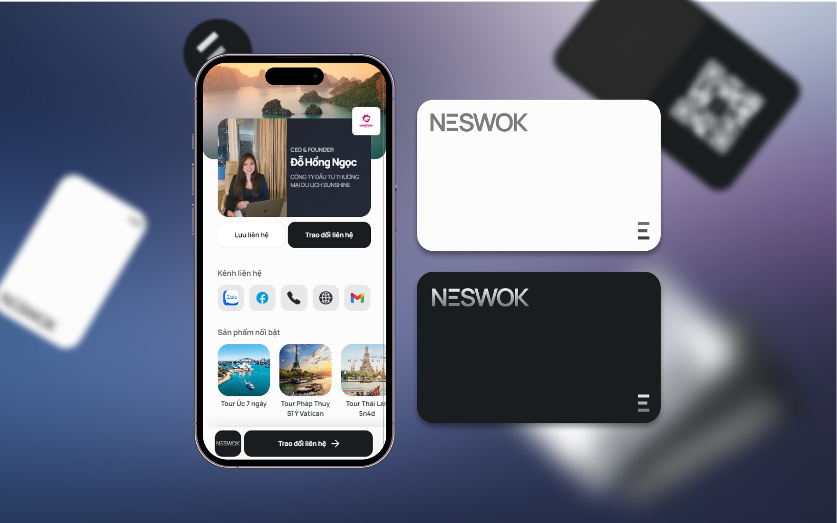Tạo danh thiếp số với mọi thông tin như: kênh liên hệ, thông tin giới thiệu, ảnh, video, sản phẩm của bạn,... Cùng với đó là tính năng phân tích hiệu quả và danh bạ Neswok giúp bạn lưu tất cả liên hệ công việc của mình ở một nơi an toàn.